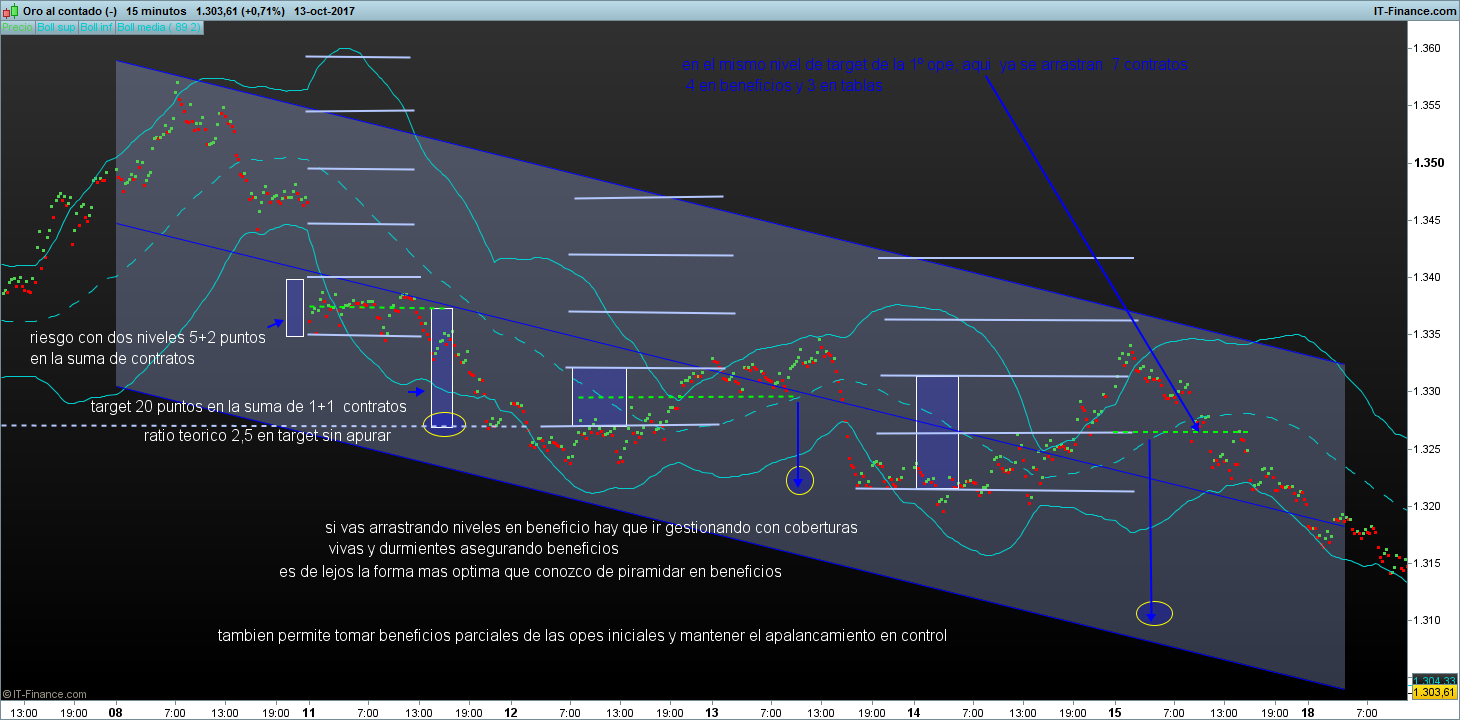 Así vas arrastrando todas las opes en beneficio sin que pierdan puntos al retroceso porque las cubres, pero como no estés bien puesto en esa dinámica de coberturas ( y aun así) y al cerrarlas te vaya en contra, hay que asumir mayor resta porque cada nivel pierde beneficio al ir el precio en contra pero son contratos que ya sumaron y suman estando en beneficios, el riesgo es mas asumible por el colchón, pero mas complejo y mas ordenes que gestionar, se puede ganar mucho mas pero porque se arriesga del beneficio que arrastras, sin arriesgar buena parte del beneficio esta problemático piramidar en beneficios.