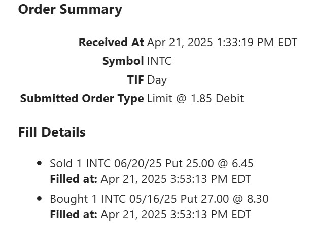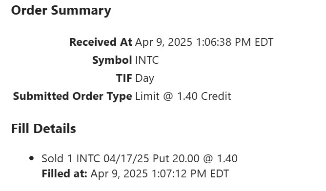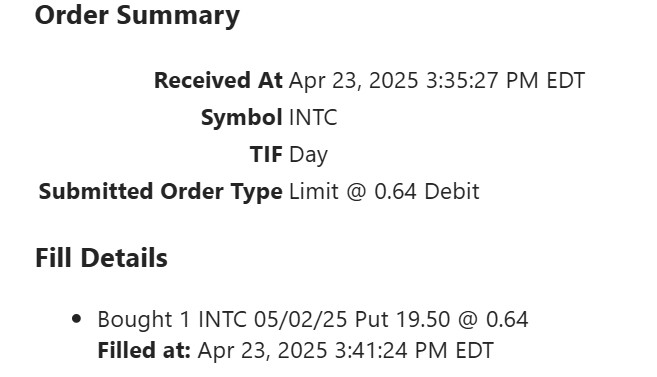 Esta cobertura es de "peor calidad" que la que apliqué anteriormente ya que sólo me cubre desde 20.00 hasta el 17 de abril y los resultados son el 24. Por otro lado ahora el coste base por acción, en caso de asignación, pasa a 21.00 con lo que el perfil de riesgo cambia ya que ahora tengo un riesgo de 1.00 por acción. No se si me asignaran las acciones o acabaré quedándome las primas, pero entretenerme me entretiene la Intel
