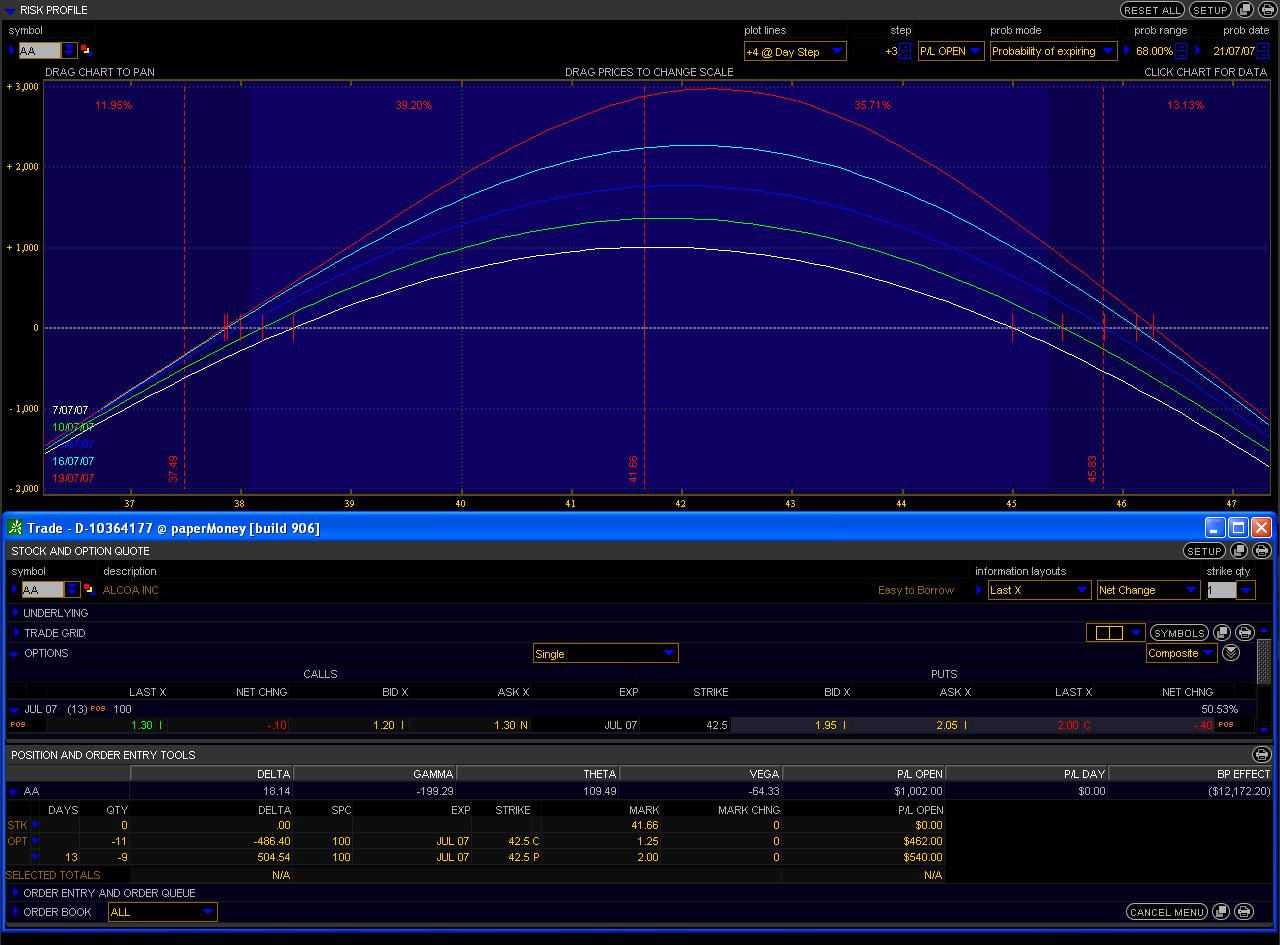 La estrategia del calendar parece que va mal, pero no es del todo cierto sin contar la cosa del vix que estaria como defensa y la semana que viene movere stops por si aca.........bueno a lo que iba que no va tan mal pues se hizo en la peor orquilla posible por lo que deshacer la estrategia dos segundo despues de hacerla hubiera costado 400$, ahora a tres semana de empezala solo palma 100$ y los dias que viene es donde ganara (o no :lol: ) el 80% de lo que tenga que ganar que seria uno 50% sobre garantias.......tambien a ojimetro.