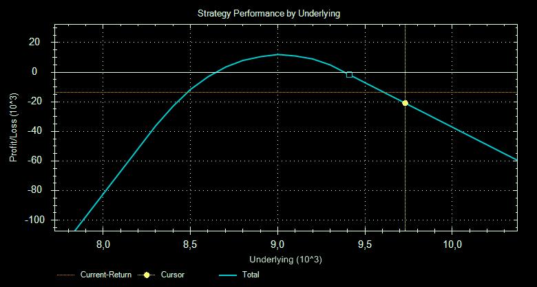 Os acordáis de El Duque? Pues se ha convertido en un pasatiempo para mí, he puesto todas las opciones vendidas q tiene en este vencimiento sobre el Ibex, amén de algunos minis para construir el gráfico. Las posiciones q tiene abiertas creo q suponen unas garantías de cerca de 300.000 euros. Sigue sin gustarme su "estrategia"