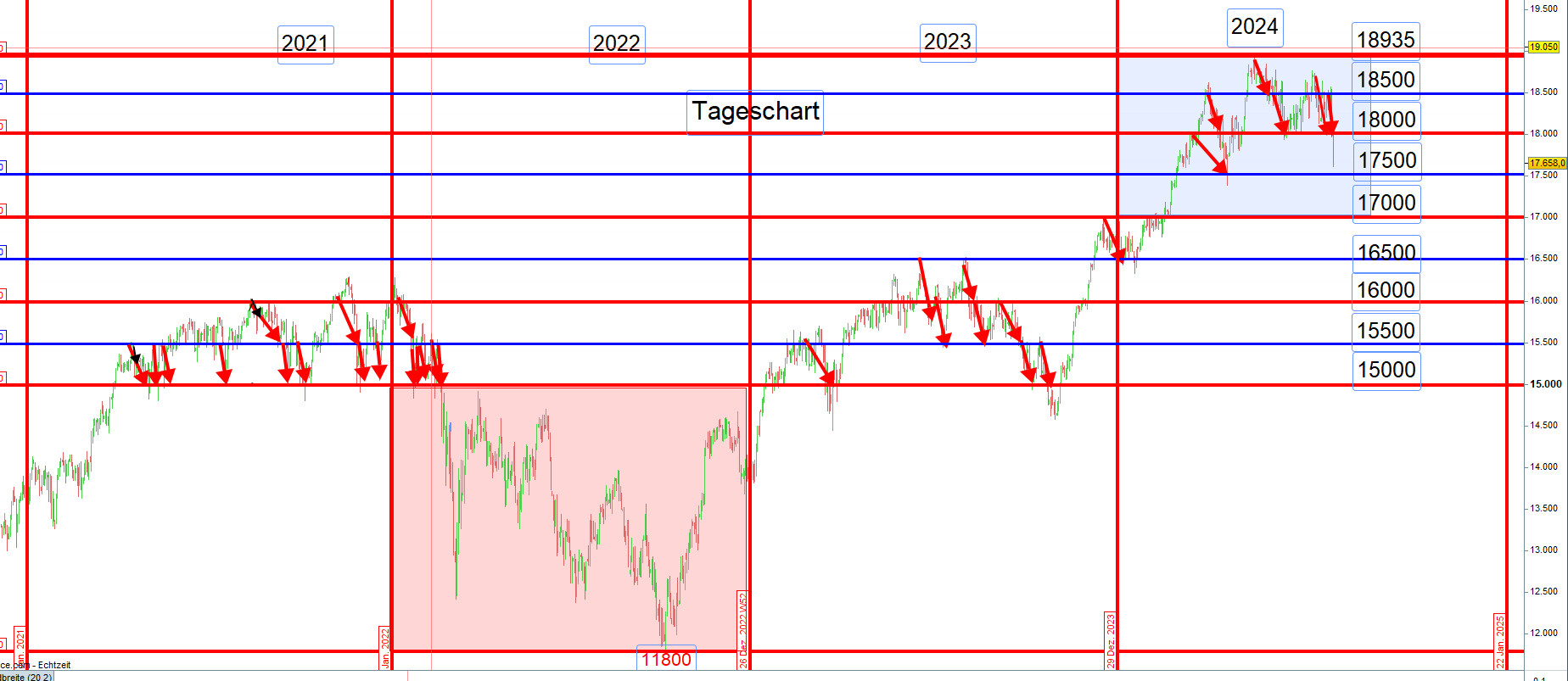Sin embargo, si escalamos este movimiento en incrementos de 500 puntos, por ejemplo de 15.000 a 15.500 y así sucesivamente, entonces el DAX ha corregido 31 veces 500 puntos, lo que corresponde a un total de 15.500 puntos en correcciones.