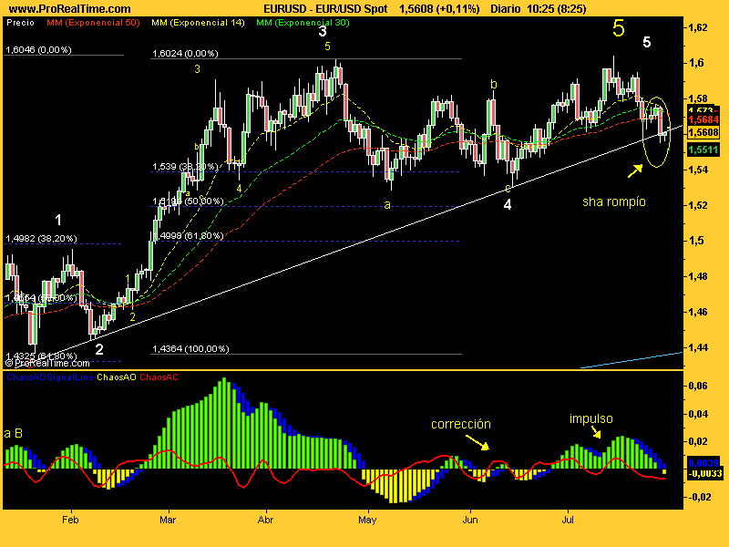 Ah, me se olvidaba erre. Te habrás dao cuenta de que esta caidita desde 1,6050 es un impulso bajista en toa regla. Si después de corregir las 5 ondas no hace nuevos mínimos pos será la onda C de una plana que empieza el 22-04. Otro dato a tener en cuenta porque sigo pensando que estamos en una cuarta y por tanto podríaamos estar en onda C = el fin de la corrección. Bra que seguirlo.