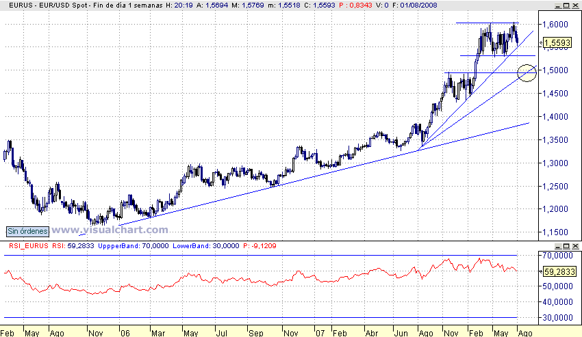 Surfer, si te fijas la línea de tendencia de la que hablas es de un grado superior a la que yo señalo y sí, está un poquito de ná más abajo. Pero la que yo señalo sí que se la ha cargao y no ha podido cerrar por encima. Y eso significa que se ha terminado un impulso de algún grado, está claro. Ahora, el problema está en saber qué tipo de impulso se ha agotado. Ahora bien, si se carga la siguiente directriz que pones que no está muy lejos, pos caidita tremenda. En el semanal el momento está decadente y hay una figura de vuelta de esas de manual de la semana pasada: un nuevo máximo y cierre negativo y a la semana siguiente cierre por debajo del mínimo....