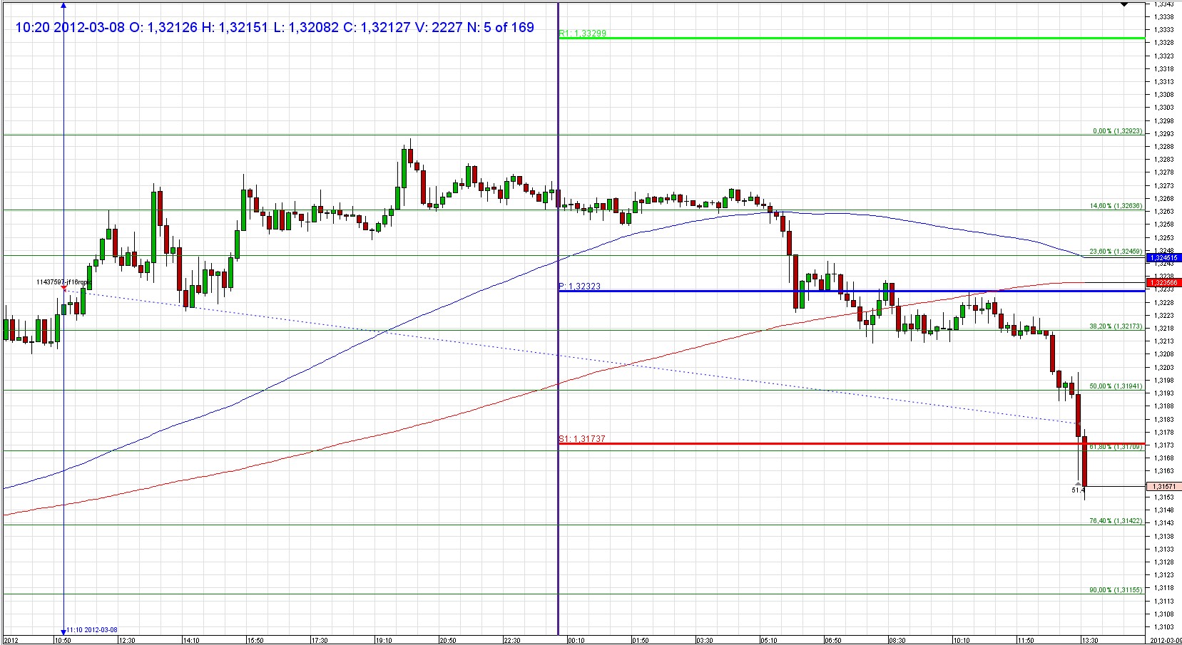 1.- buenos datos del NFP y TD que eran lo más evidente que sucediera con la economía norteamericana. La clave la dio el presidente de la FED en la conferencia, hay que leer entre líneas que los datos de empleo eran muy buenos. Así que previendo este contexto sin importarme en lo más mínimo el “éxito” del canje de deuda que ya lo descontaba, tenia que posicionarme corto adyacente del pivot mensual y para ello busque la resistencia diaria más cerca que era el 1,3232 y el TP cerca del soporte más próximo.