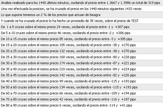 Del estudio antes puesto de los cruces, se deduce que hay pocos precios que se repiten, por lo tanto se puede sacar como conclusión que cuantos más cruces en un tiempo determinado se den más parado esta el precio y en un razonamiento inverso a niveles bajos del número de cruces hay una tendencia establecida.