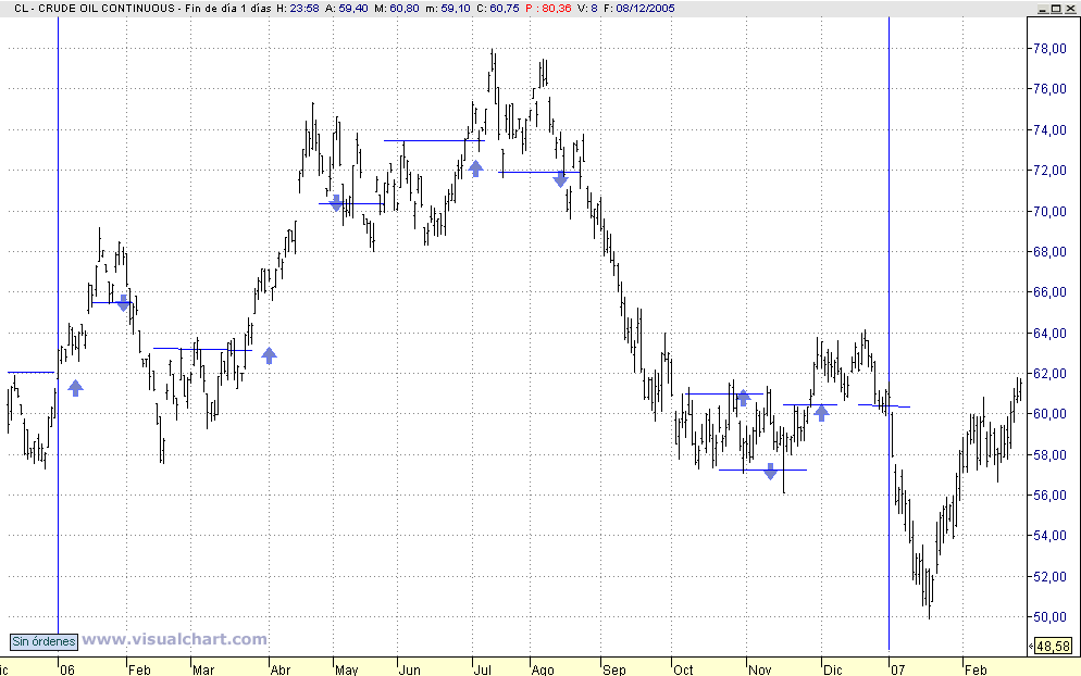 basicamente esas fueron mis entradas durante el 2006 en el crude oil pero donde ves la flecha me pasaba a grafico de 1 minuto operando range breakouts y colocando mas contratos si podia poner breakeven stop.................