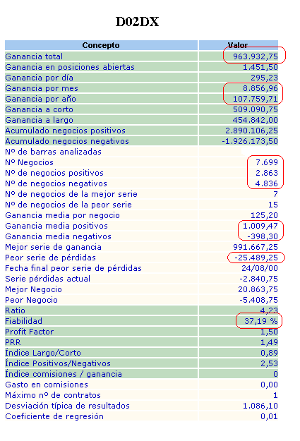 Sobre las comisiones no consigo acertar a ponerlas bien en las estadísticas. Sin el Dax tenemos 7700 negocios (compra y venta) a 5 euros en un broker con el que trabajo son 10 euros operación. Restamos los 960000 euros menos los 77000 euros y esos son los resultados reales.
