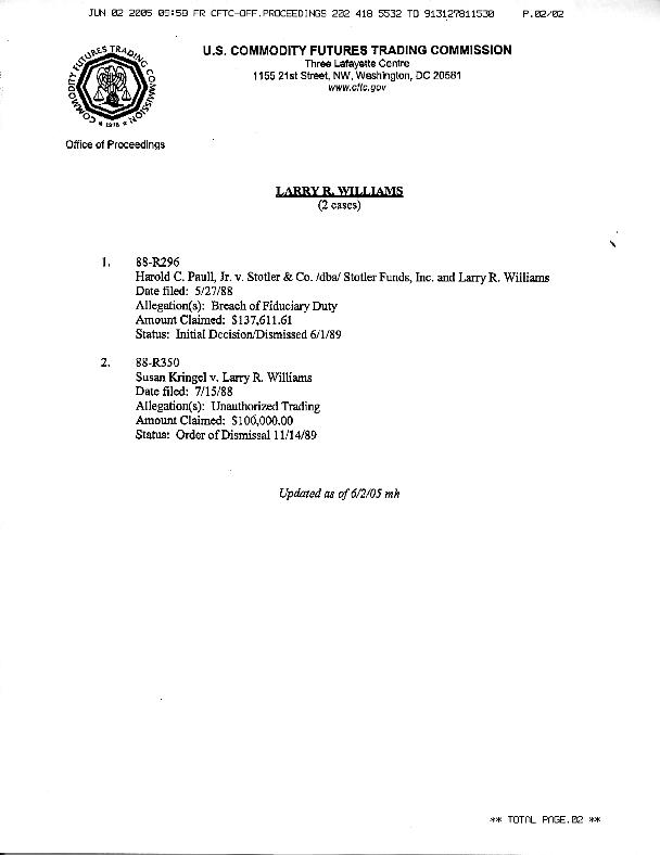 Os adjunto copia de 2 denuncias de clientes suyos de un juzgado Americano en donde se le reclama a Larry Williams por cientos de miles de dolares volatilizados y por irregularidades en su gestion de patrimonio...................