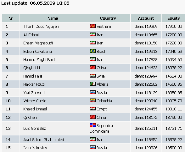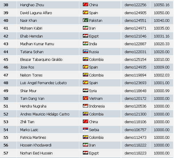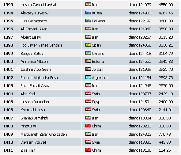 Este broker es un tinglado de mucho cuidado. Para el mundo de habla hispana es conocido como IFC Markets, pero en otros países tienen otra denominación distinta y creo que funcionan como divisiones distintas aunque el concurso lo hacen en común. Es evidente que en ciertos países tienen más calado que en otros.marceva escribió:Alguien podría hacer algún comentario al respecto de los paises que copan los primeros lugares, Iran, 300 personas, Vietnam, Siria, incluso Iraq, con la que les está cayendo con 14 participantes....
