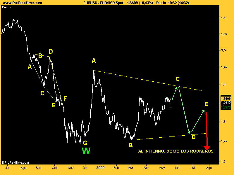 Yo también Santojob, (qué significa el aut si pue saberse, que me tiene intrigao?). A corto plazo veo veo ese triángulo. Ahora estamos en la onda C. Si es cierto ese triángulo no irá muy lejos y después pos eso.. :shock: Según Neely el triángulo rompe en contra de las ondas rápidas que lo forman. Si nos fijamos las ondas rápidas son las que van parriba, con que romperá hacia abajo :shock: que Dios nos pille confesaos y cargaos de puts :lol: El máximo que haría esta onda C se quedaría muerto de risa y casi seguro que no pasa de 1.40 el bicho
