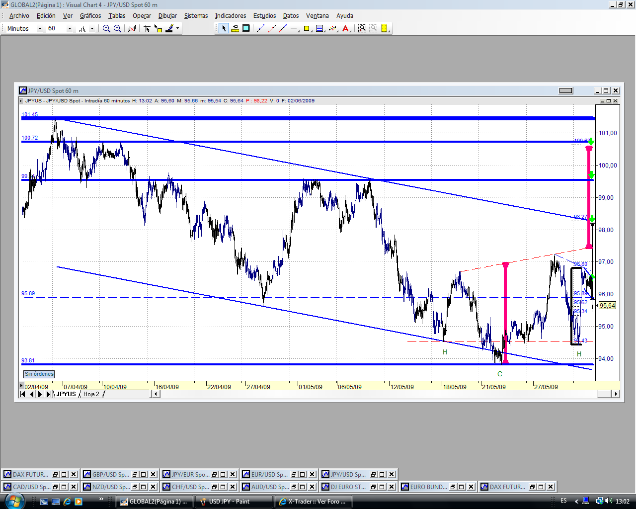 La superación del 96.10 (retroceso del 60%) del tramo bajista nos llevaría al 96.30 donde tendríamos dos h iguales a partir de la linea clavicular. El siguiente objetivo seria el retroceso de todo el tramo bajista en el 96.60 donde coincide el 161.8% del primer microimpulso.