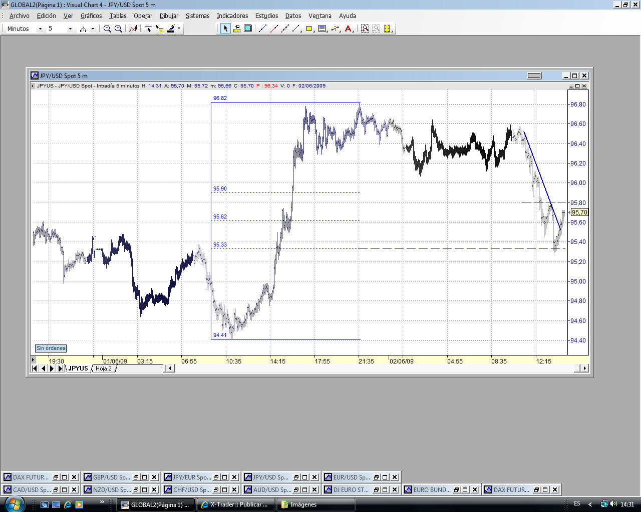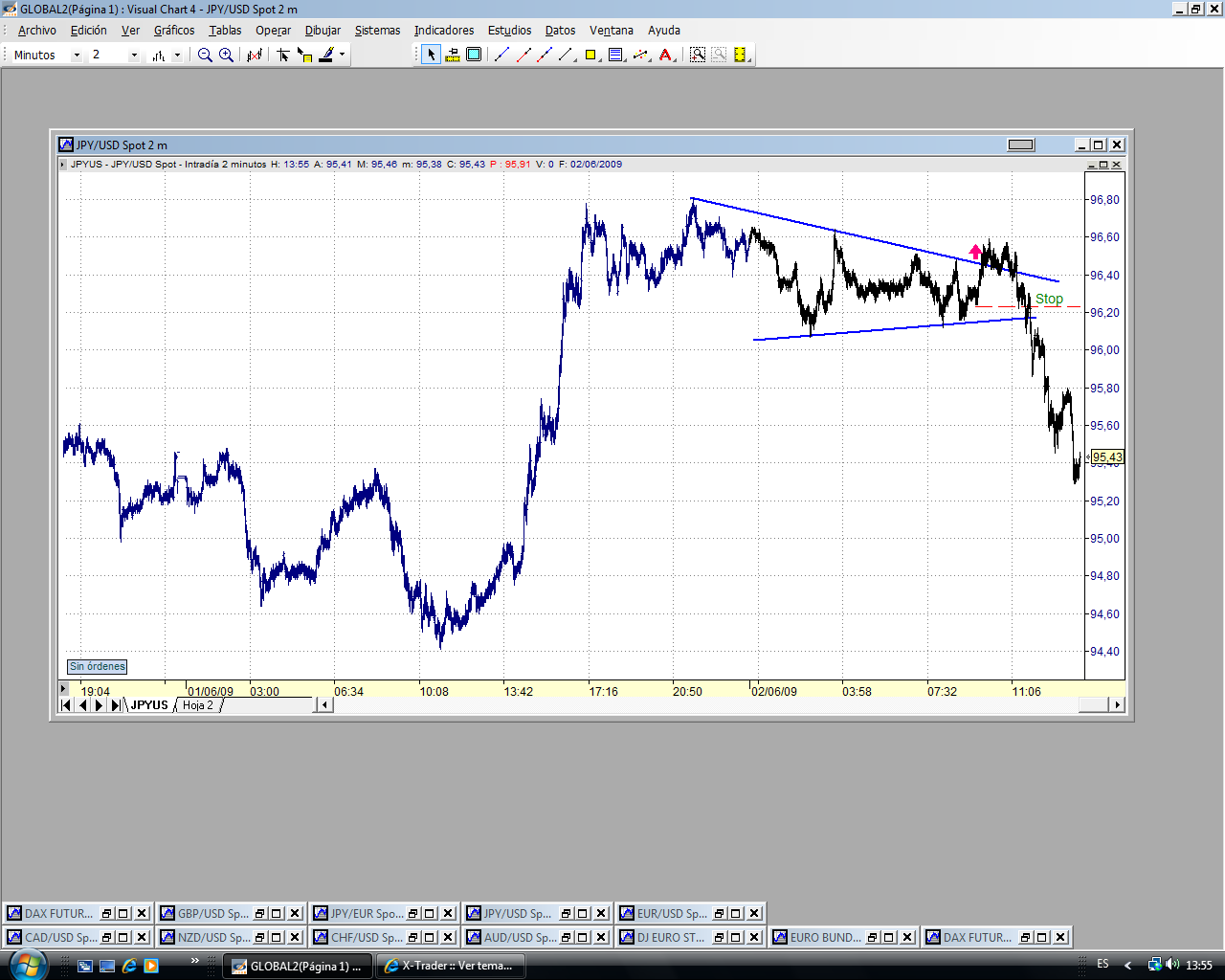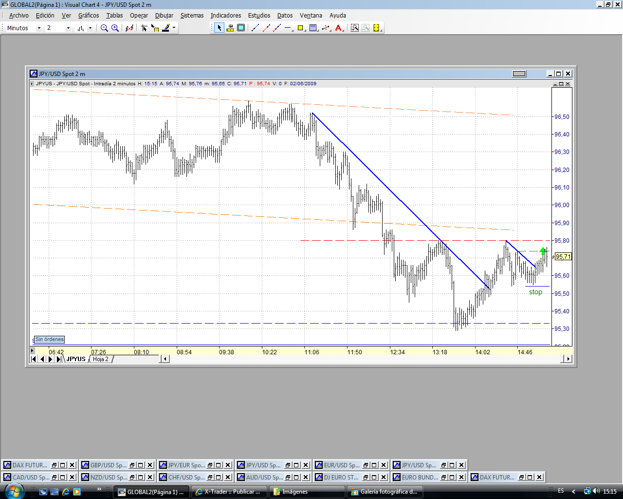 De momento han apoyado el precio en el 95.30 que se corresponde con el 60% de toda la subida de ayer. Ha roto la directriz bajista y parece que se va al 95.80 (último tramo bajista desde el 96.60. Vamos a ver qué pasa.