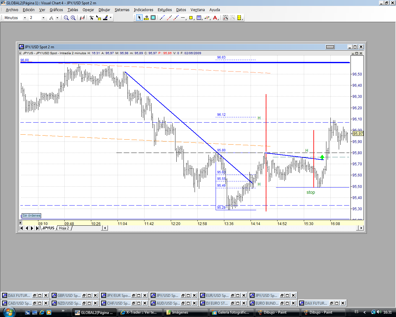 El 96.10 ha actuado de resistencia y han girado el precio a la cresta del primer impulso en el 80 donde subimos el stop. Ha habido suerte y no se ha cruzado ninguna operación en nuestro número. Seguimos en el mercado.