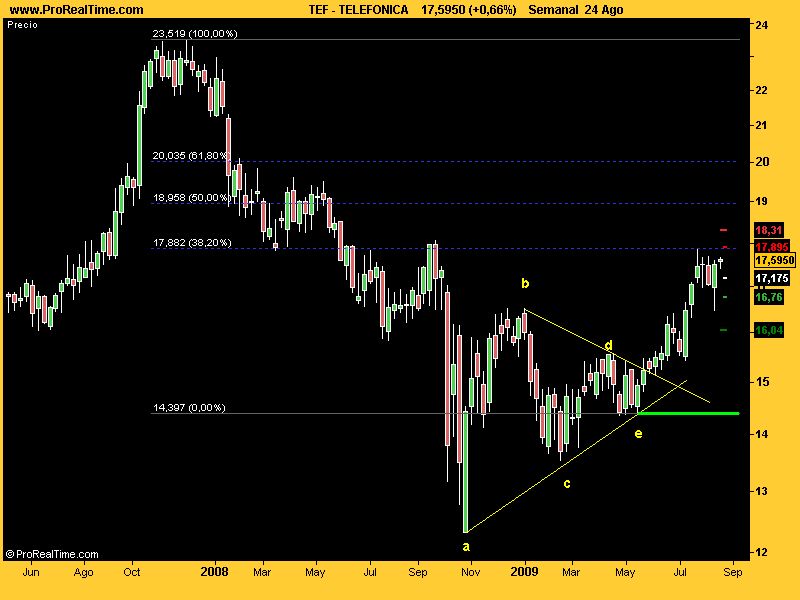 pero esto ha hecho un suelo triangulando y entonces el fin de la caída es posterior y más alto que el mínimo: la caída termina en mayo en 14.40, luego el stop ahora mismo es claro y no lejano...Ahora se enfrenta a una resistencia muy fuerte, como podemos ver...pero un suelo de este tipo es un suelo duro duro duro...con que tiene que durar un rato bueno hacia arriba. Aunque suena clásico, me parece el mejor sitio pa poner pasta ahora del ibex...