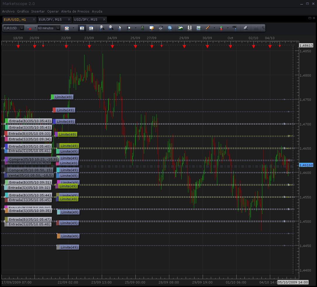 Los limites los tengo (ire cambiandolos a lo largo de la semana) entre 1,44 y 1,48, mientras no se me acerque o se pase de estos limites yo ire sumando pipos de ganancia (mientras pase mas de 2,5 veces por cada sitio en promedio)...