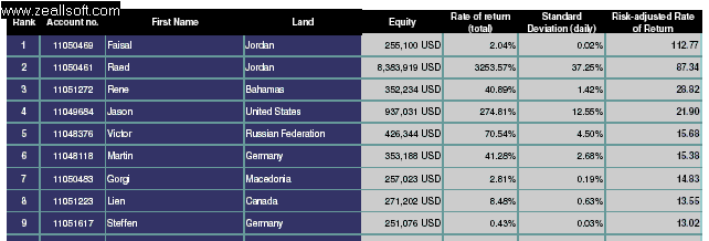En este concurso con calculo del ajuste del riesgo, está la cosa más definida...excepto el segundo...un galguero con mucha suerte, los primeros puestos no son casualidades....el primero ha ganado un concurso con 2.000$ de beneficio partiendo de 250.000 $ con eso está todo dicho...