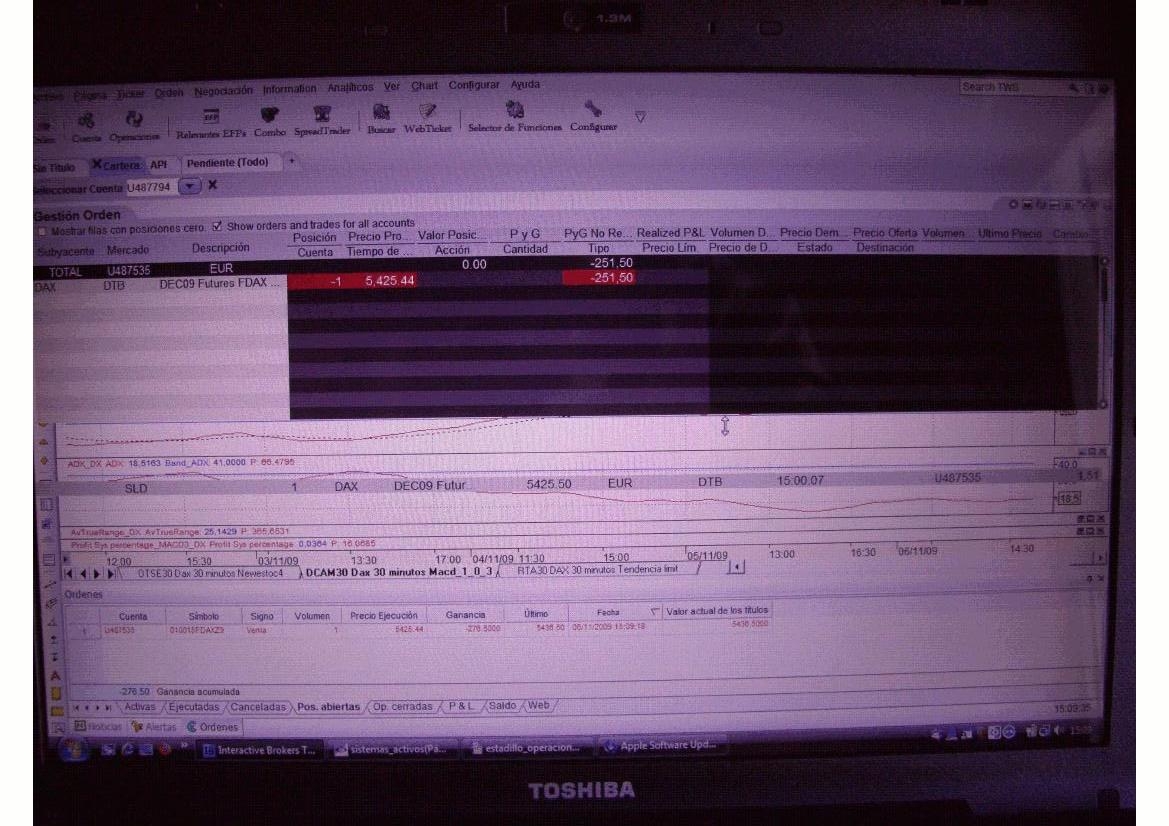 Llevo bastantes días con un error en la TWS de IB (desde noviembre de 2.009). Ya he abierto ticket en IB para ver que solución dan al mismo. Utilizo visualchart (VC) con los sistemas automáticos, conectado con Interactive Brokers (IB). El error es el siguiente: cuando VC lanza una orden (porque así lo hace el sistema), la TWS lanza la orden a mercado y se ejecuta sin problemas. El problema viene a posteriori. Si quiero ver la ventana que corresponde a la TWS, no se ve la misma completa, sólo a trozos y es imposible, si quisiera o necesitara hacerlo, operar directamente en la TWS. Inclusive para poder cerrar la TWS debo hacerlo desde la barra inferior de windows. Cuelgo una imagen de la pantalla que espero clarifique mejor el problema. ¿ A alguien le sucede algo parecido ?