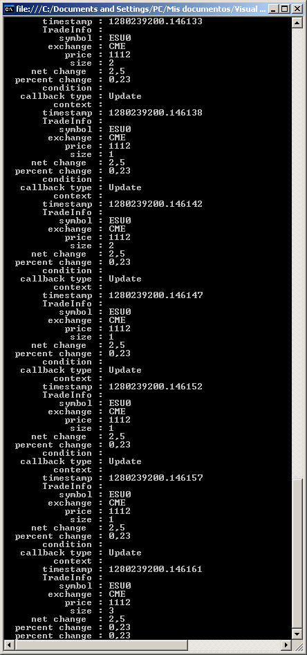 Ahora ya he conseguido conectarme a Rithmic y bajarme prints del mini-sp. Por ahora es muy rudimentario con salida a consola. Hay que construirse todo el GUI pero bueno, poco a poco. La velocidad del stream es brutal.