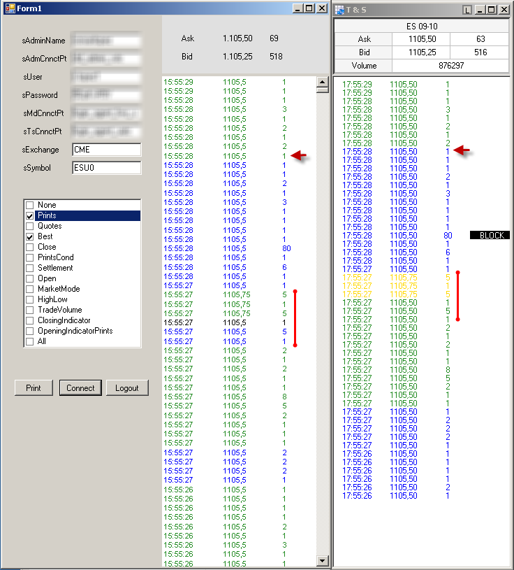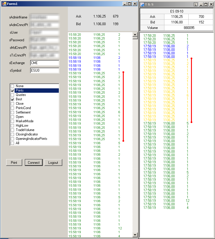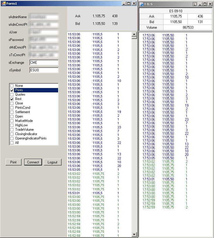 La GUI no es más que un Form windows con un panel a la derecha para escribir la información de los prints y arriba los datos de la horquilla. A la izquierda del formulario están los campos para entrar los datos de conexión y abajo un grupo de checkboxes para seleccionar la información que se quiere recibir de Rithmic.
