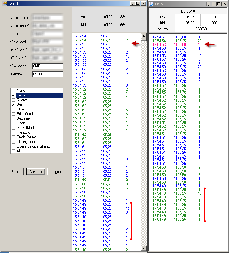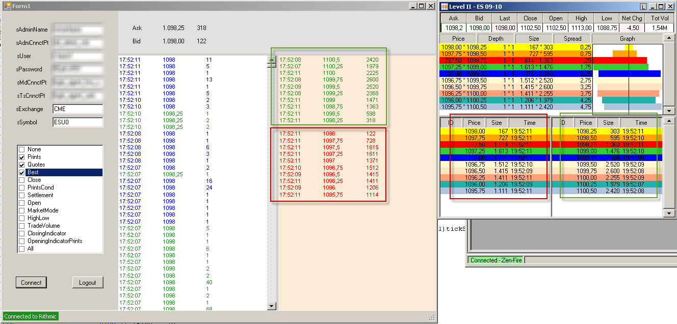 En esta prueba voy a recibir desde Rithmic los datos de la horquilla (Best) y los trades (Prints), para el mini-sp vcto.sep2010 (ESU0) que es lo que he marcado.