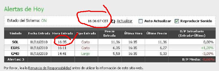 Sí te puedo asegurar que las alertas no las manipulo (lo puedes comprobar fácilmente si las sigues un par de días). Cuando se publican empieza el P&L o B/P desde 0%. Lógicamente puede haber algunos segundos de retraso al escanear, aplicar las condiciones y publicarlas en la web. De todas formas como comentas, a veces se puede llegar algo tarde, pero muchas veces se puede entrar mejor que la propia alerta, ya que siempre entro en máximos o mínimos y suele ocurrir que retrocede para tomar aire y luego repunta más tarde. Pero bueno voy a hacer lo posible para mejorar este tema de precisión.