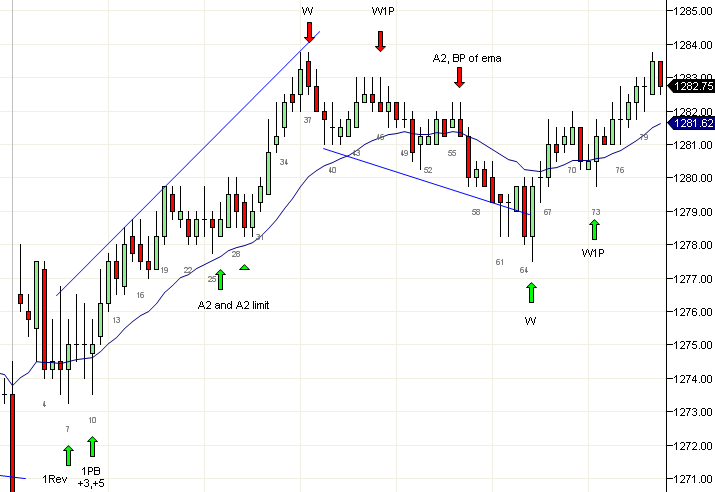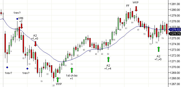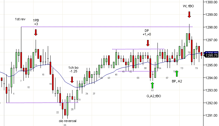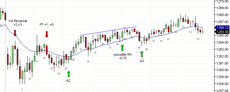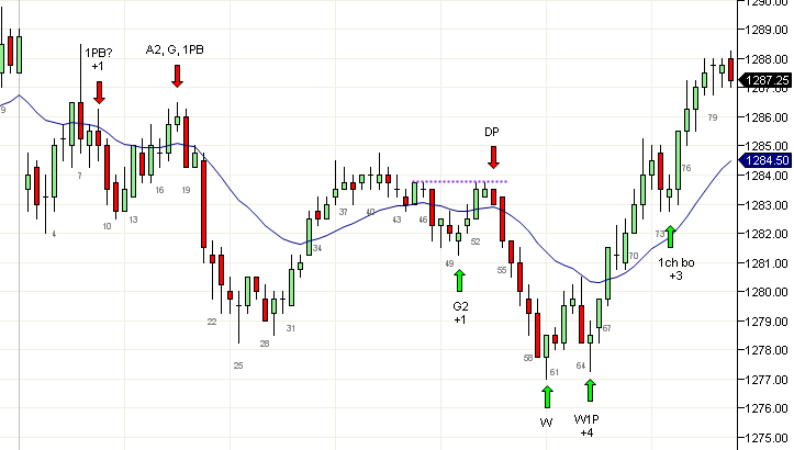 El mercado se movió por encima del doble tope en la vela 38 y trató de fallar dos veces en las velas 42 y 46. Esto también fue un movimiento en tres empujes en un canal y actuaría como cuña. Si esto se disparaba y fallaba, existía la posibilidad de un movimiento proyectado de 5 puntos hacia arriba. Pero el precio se movió en contra de los compradores dos veces y una salida debajo de la vela 53 era apropiada. La vela 56 dio una oportunidad de A2 en largo y esta fue la última operación razonable del día. Las velas 73 y 74 formaron una posible bandera final (FF) o un doble tope (DT) pero de acuerdo al comportamiento del día es mejor dejar pasar dichas operaciones cerca del fin de la sesión.
