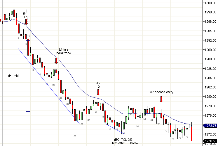 Operar una tendencia con movimientos violentos y velas largas es muy difícil ya que obtienes muy pocas entradas y cada entrada se mueve un gran número de puntos. Cuando veas dos o tres velas de tendencia con muy poco solapamiento, ya sabes que se trata de uno de estos días. A menudo la mejor entrada es en la primera retracción, que en el caso de una tendencia ‘dura’ como esta es un tipo especial de H1 fallida (fH1) que comúnmente produce un movimiento proyectado hacia abajo. Entre más brusco sea el movimiento antes de la retracción y entre más débil sea la retracción como hoy, mayores son las probabilidades de alcanzar o exceder el movimiento proyectado. Muchas veces, después que se ha alcanzado el movimiento proyectado se produce un rango ajustado de trading, por lo que me salgo y espero más Acción del Precio. En la mayoría de los días, aguantar una fH1 hasta el fin del día puede ser redituable, como lo fue hoy.
