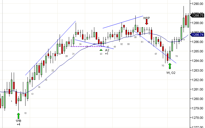 La vela 17 fue una vela de gap y un movimiento de dos segmentos a un mínimo más alto, y es la mejor opción de swing del día. Este movimiento debe intentar romper por encima del máximo del día e intentar lograr un movimiento proyectado de la retracción, esto es 1294.75.