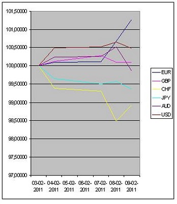 Desde el inicio de esta cuenta (26-1-2011) que se ocupa de esta estrategia se han cerrado 49 trades, 38 de ellas positivas, acumulando una ganancia de 2.070 puntos. Las posiciones abiertas ahora tienen una pérdida de cerca de 1.050 puntos. Por lo tanto la valoración actual de la cartera de divisas es de unos 1020 pips.