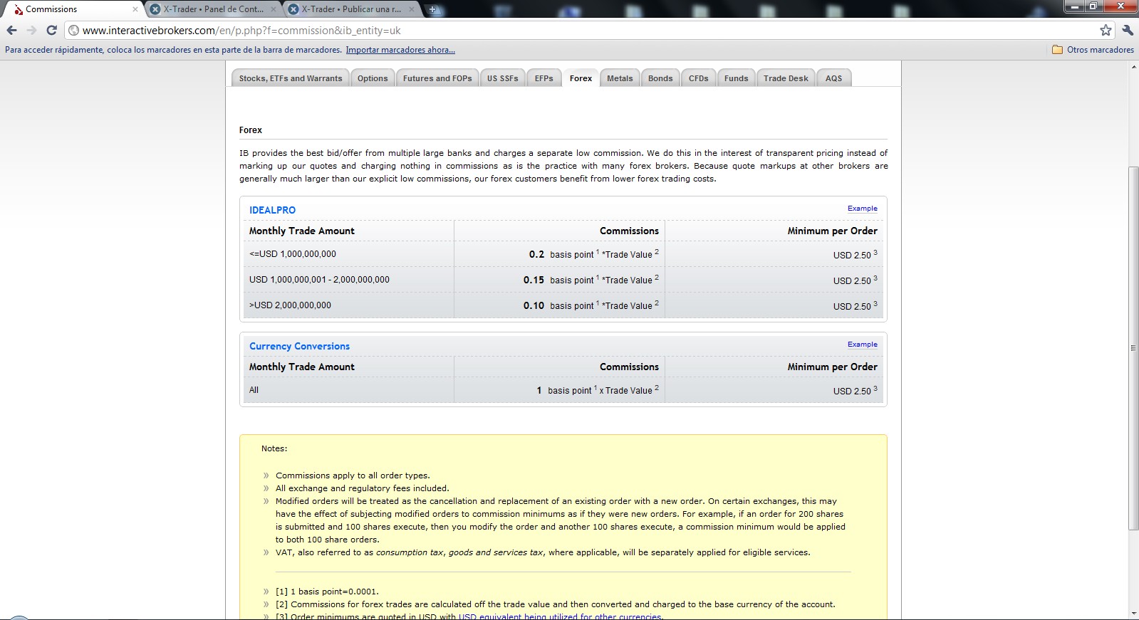 En cuanto a la captura que has puesto debes pinchar donde pone Futuros and FOPs (has pinchado en Forex) y luego en US markets, ahí veras una comisión de 0.85 que debes sumar a otras dos que hay en otro enlace (Exchange & Regulatory Fees) aquí: http://www.interactivebrokers.com/en/ac ... entity=llc y miras donde pone: E-mini Forex Futures E7, J7
