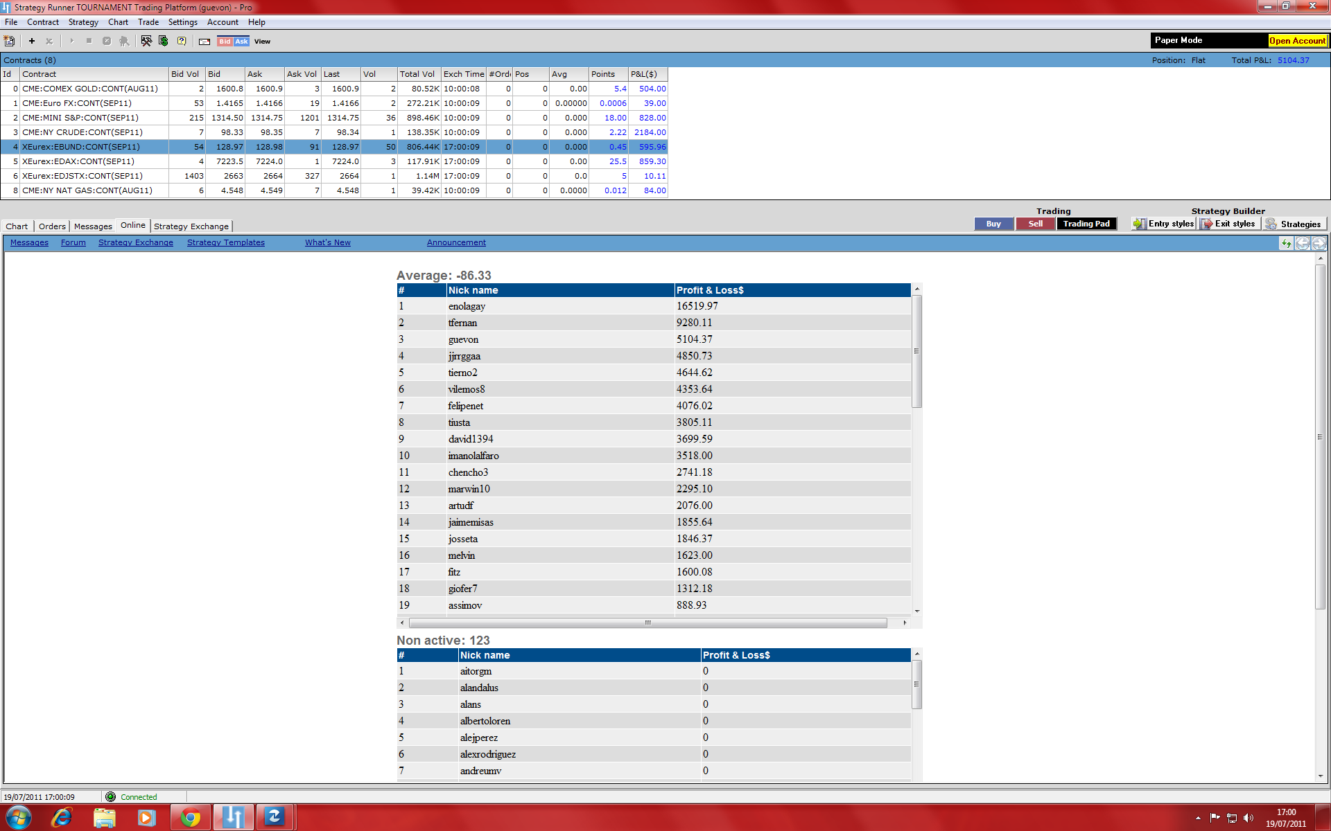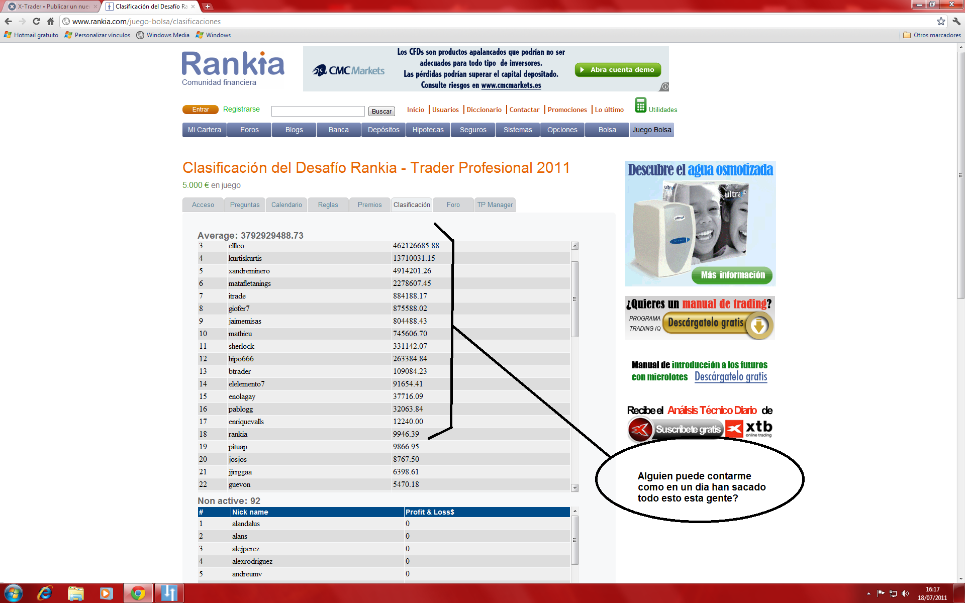 Yo si estoy apuntado, mira por el puesto 60. Me ha funcionado bien la plataforma sin problemas, pero sólo he hecho una operación en el eur/usd esta mañana a primera hora con un saldo de +350$ de ganancia y al ver que en la clasificación figuraba con -97.000$ he pasado de seguir operando hasta que se aclare todo el tema.