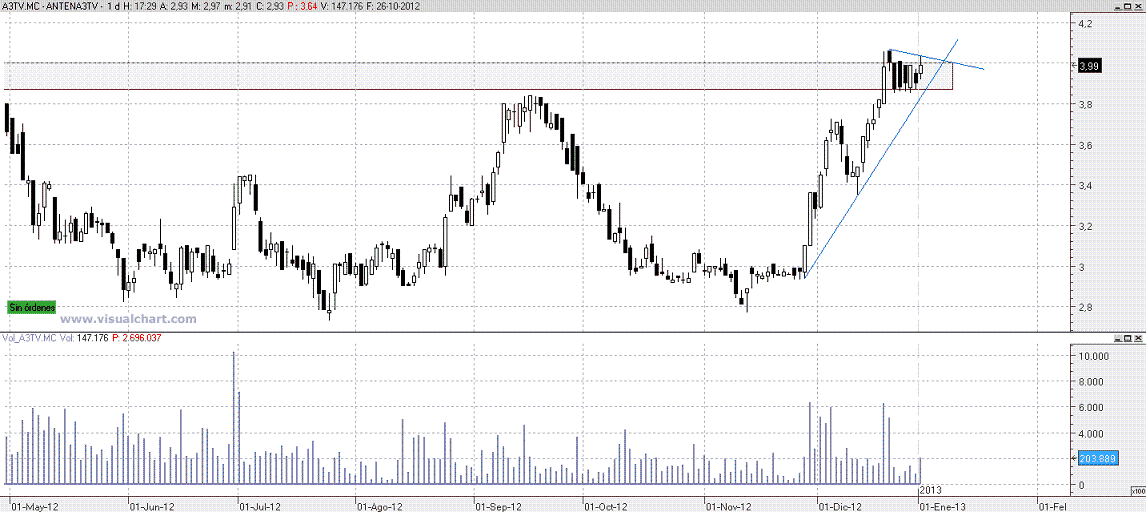 El valor sigue su canal alcista y parece que quiere romperle por la parte de arriba. La zona de entrada estaba en el 35,50. La hizo hoy, veremo si sigue progresando. En caso de retroceso no debe perder los 34.