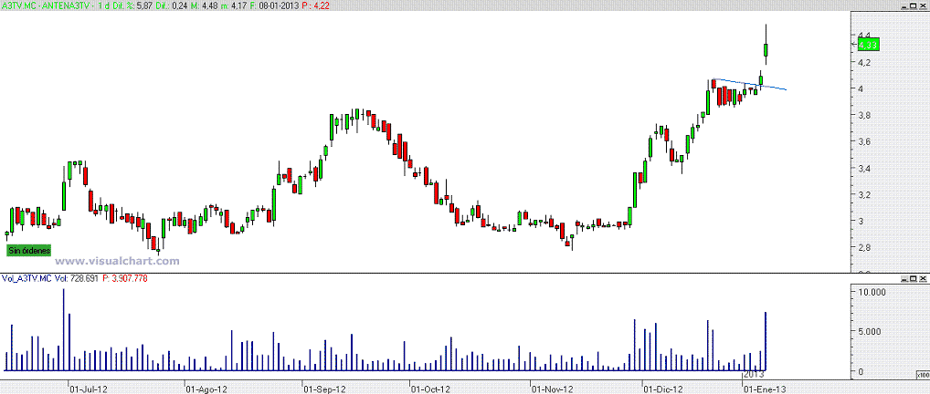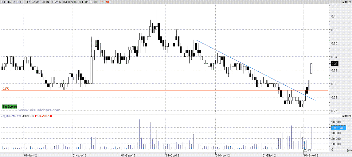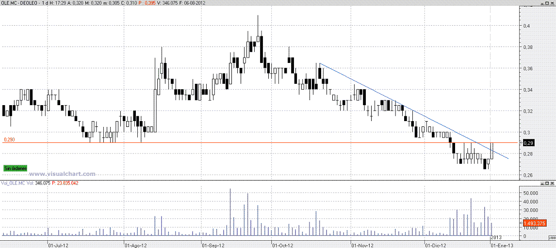 -- Deoleo. Ojo con este valor, que no es muy liquido. Ese volumen fuerte que se ve en la zona en la que se está moviendo, primero amagó hacia abajo, y luego ha recuperado con claridad. Si corta el 0,29 puede ser una acumulación profesional, pero yo esperaría después a ver el retroceso como es, si con oferta o con demanda. Valor para vigilar.