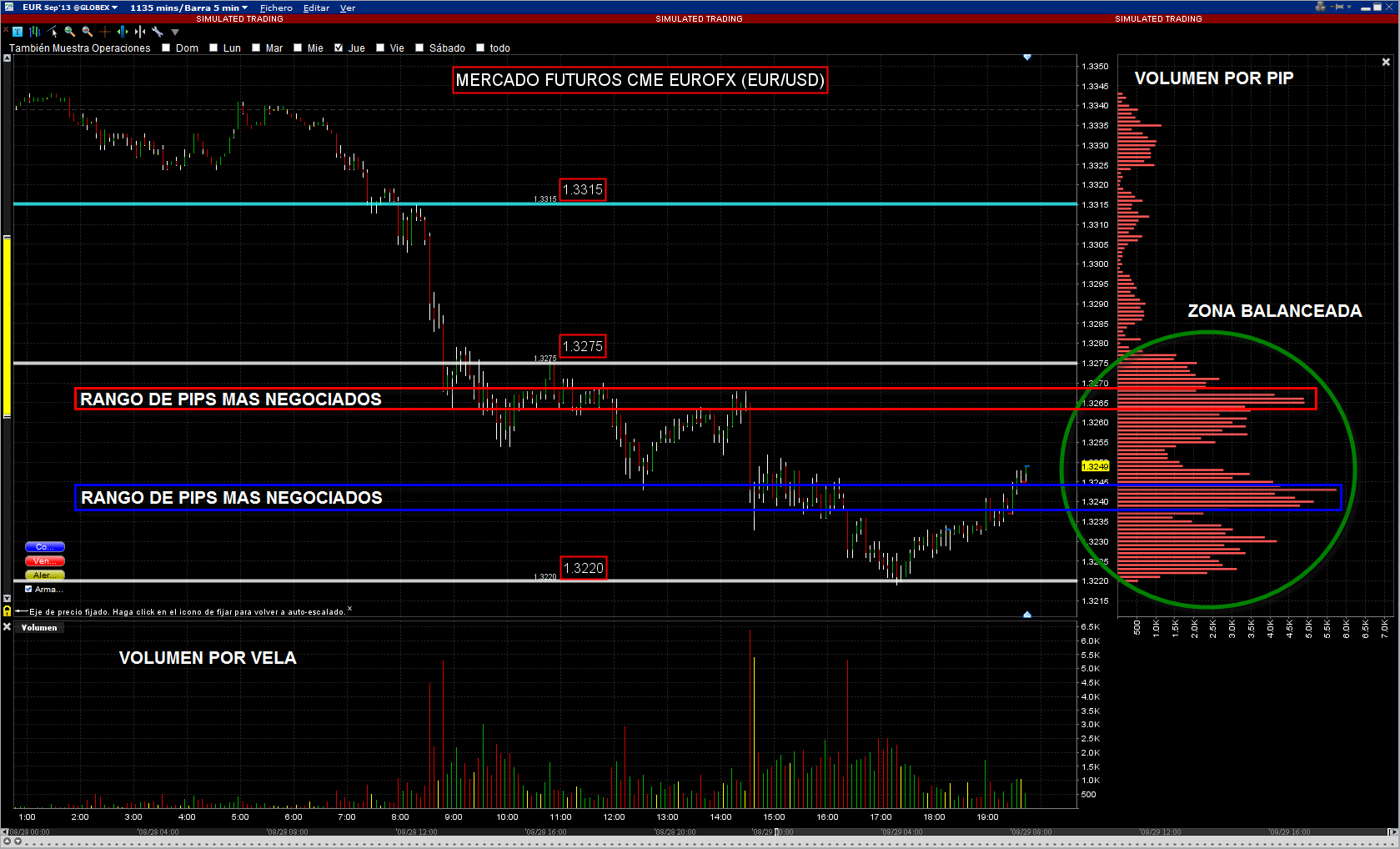 Y ahora el mismo gráfico del EUR/USD futuro EURFX con la información del volumen. ¿No te da cierta ventaja poder tener esta información? Desde luego no es todo el volumen del euro dólar... es el volumen del contrato de futuros que al estar arbitrado es una representación fidedigna del volumen global. Información que sabiendola manejar te permite fabricar una ventaja ya sea usando el flujo de órdenes o el market profile o cualquier otro sistema que utilice el volumen. Y una ventaja es lo que todos buscamos, ¿No?