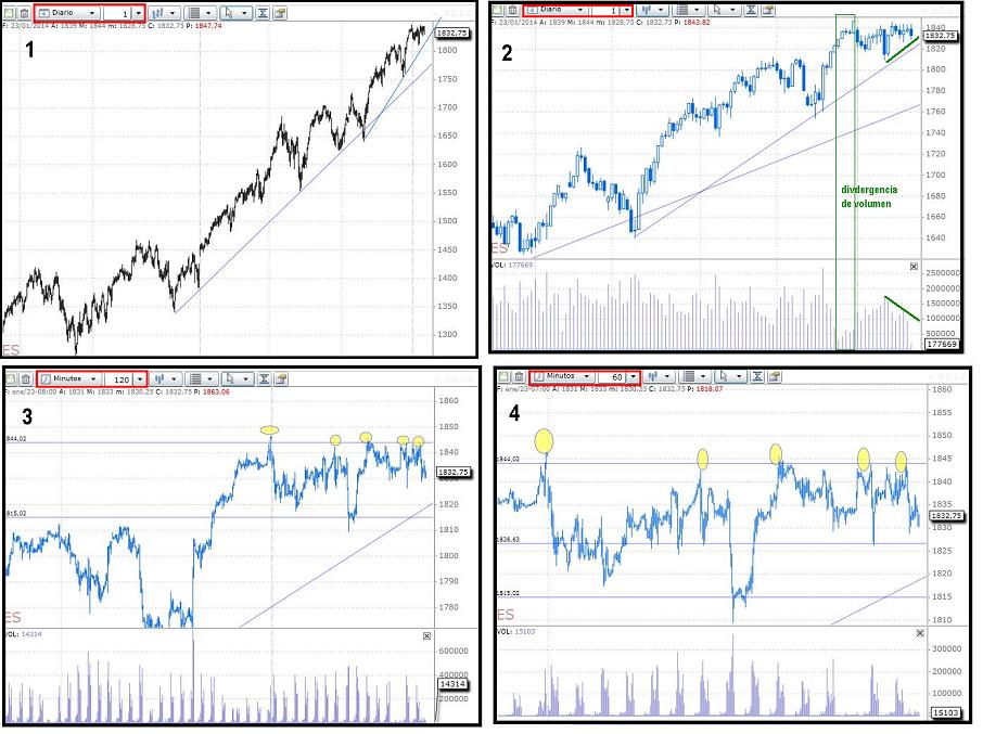 Imagen 2. Para mi la más ilustrativa. Se aprecia como el dinero profesional se retira del escenario (rectángulo verde). El precio sube por inercia, pero los profesionales no lo están empujando. Esto es el origen del la literalidad que estamos sufriendo. Las últimas 7 velas pasa más o menos lo mismo. El precio no desplaza, y el volumen va decreciendo. Así no se rompe el 1844.
