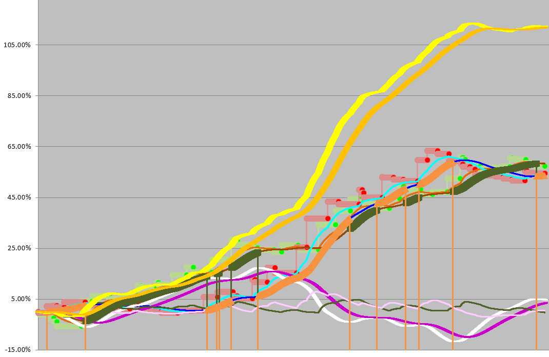 http://www.x-trader.net/articulos/trading-general/perry-kaufman-dominar-el-trading-sistematico.html escribió: No creo que pueda escoger un conjunto de parámetros y esperar a que sean los mejores para el mes siguiente, así que uso múltiples parámetros para obtener un resultado medio. Podría ser demasiado conservador para muchos traders, pero me remito de nuevo al caso de la tortuga y la liebre.
