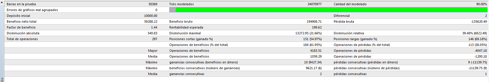 Seleccionando alguno de los mejores puntos y "cargando un poco" de lotes (4 lotes para 10.000 EUR) obtenemos este resultado para un backtest en el mismo periodo: