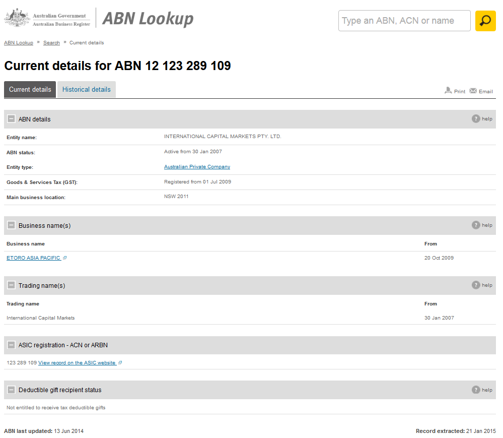Pues sí, resulta que echando un vistazo al registro de compañías de Australia acabo de descubrir que IC Markets es en realidad eToro Asia Pacific!!!