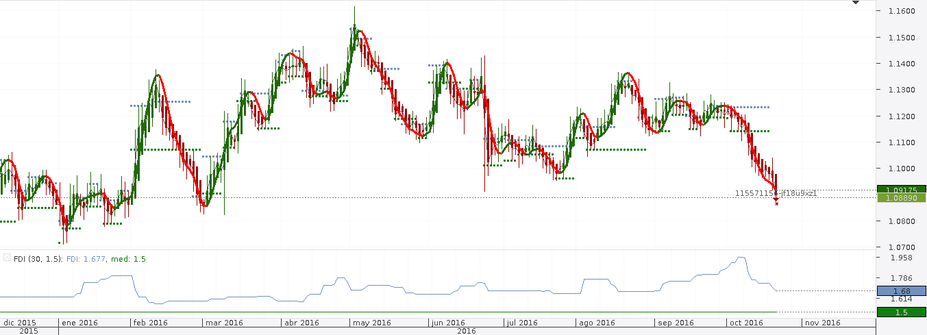 Efectivamente, el FDI mide muy bien cuando el mercado sale de un lateral. Si miras el gráfico que adjunté como ejemplo verás que cuando el indicador comienza a descender y supera la línea de 1,5 (Color verde) el mercado va entrando en una zona de distribución (lateral) y luego cuando vuelve a subir el mercado comienza a coger tendencia. Lo que mide el indicador es la fractalidad, cuando hay tendencia el mercado empieza a ser lineal y cuando entra en lateral se vuelve más fractal. Obviamente no es la panacea y no se puede operar únicamente con este indicador pero puede resultar de ayuda.