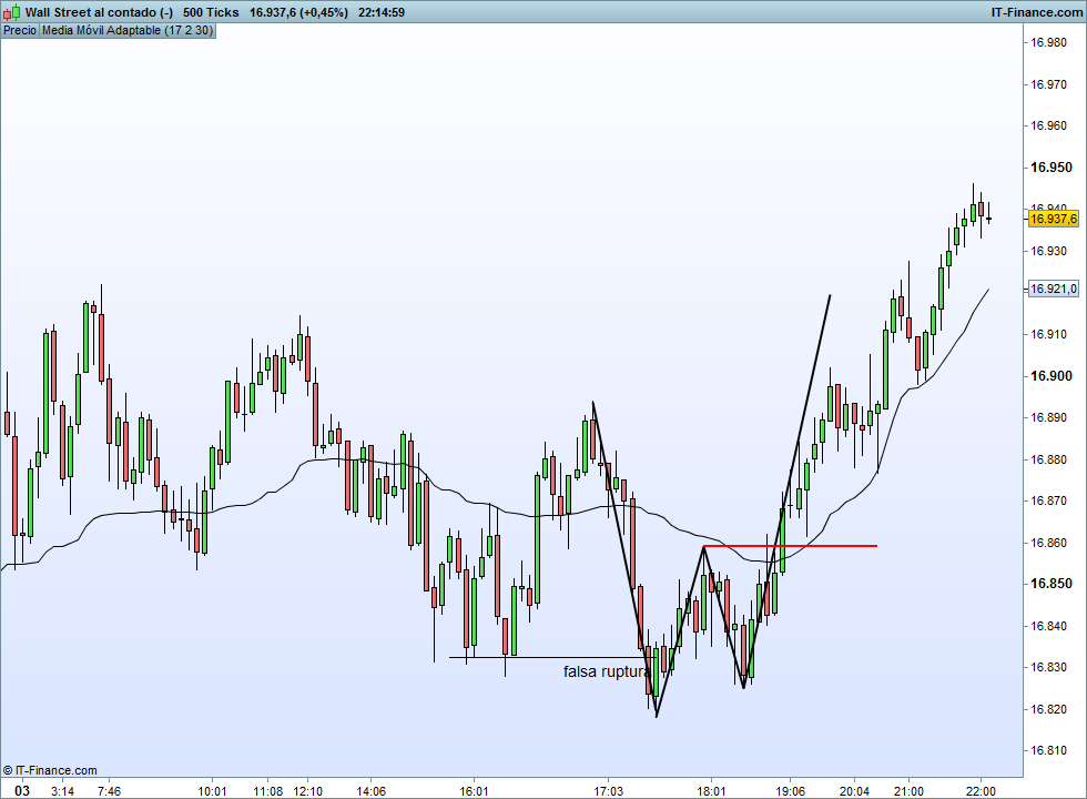 Cuanto más clara se ve la dirección más probable es que el precio vaya en la contraria porque sería muy fácil subirse a un movimiento iniciado y esperar, pero el problema es que se puede entrar largo justo en el máximo para largos o en el mínimo para cortos por eso es conveniente entrar a favor de tendencia ( si no hay patrón de giro)en los retrocesos en soportes-rsistencias, en ese grafico que cuelgo se ve la falsa rotura esta tarde a las 17,25 fue un engaño para romper en la dirección contraria y como ese ejemplo los hay cada dia, sin embargo cuando marca la reversal por estructura el precio se va rápido y vuelve al nivel de ruptura pullbakeando, ese es el punto de menor riesgo en cuanto a fiabilidad en relación riesgo-beneficio