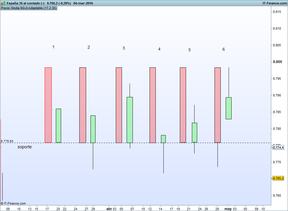 Si eliminamos el soporte de ese escenario y sin tener en cuenta otra información del contexto que no sea la tendencia, entrar largo en cualquiera de esas 6 situaciones es ir contra la tendencia, es buscar el giro con mínimas probabilidades de acierto porque en ninguno de esos 6 ejemplos hay patrón de giro