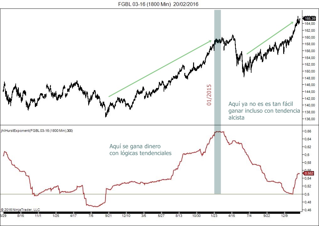 Entiendo que Hurst te dice si un subyacente es mas o menos tendencial (o lo ha sido historicamente). Vale, ¿eso te sirve para tu estrategia?. Bueno, tal vez para estrategias diarias tendenciales puede servir algo, pero yo no soy capaz de llegar a mas conclusiones sobre esto.