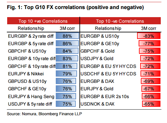Interesante el informe de Nomura en el que analizan las correlaciones de los diferentes pares de divisas versus otros activos como tipos de interés, índices bursátiles, oro, etc. El informe para este mes muestra las siguientes correlaciones: