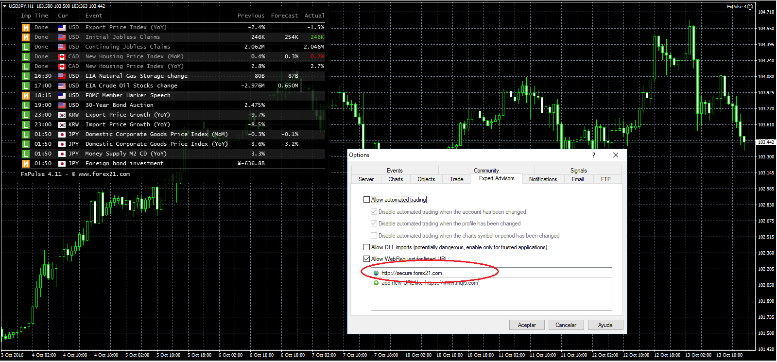 Para que funcione recordad que, en la pestaña Expert Advisors de las opciones de vuestro terminal, debéis autorizar una Webrequest al dominio http://secure.forex21.com tal y como se muestra en este pantallazo:
