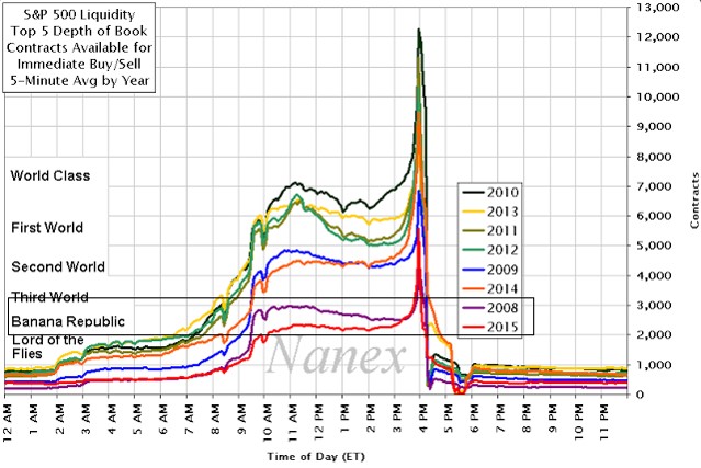 Como hay un gran aumento de la utilizacion de los ETF, hace que huyan de los futuros causando baxas de liquidez durante la session, aumentando unicamente la liquidez en la final de las sessiones