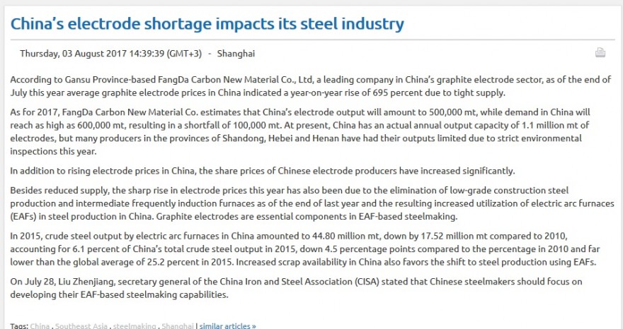 O sea el precio de los electrodos de Graphyte se disparo y se piensa que sea algo regulatorio por parte del govierno Chines