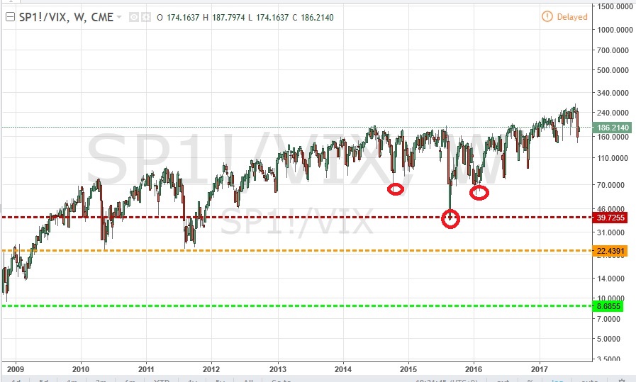 POr acaso me gusta ver mas el ratio sp500/vix que el ratio bono/vix (son muy parecidos pero usando el sp en vez del bonos estamos retirando de la equacion variacion de precio y medir el verdadero myedo del mercado