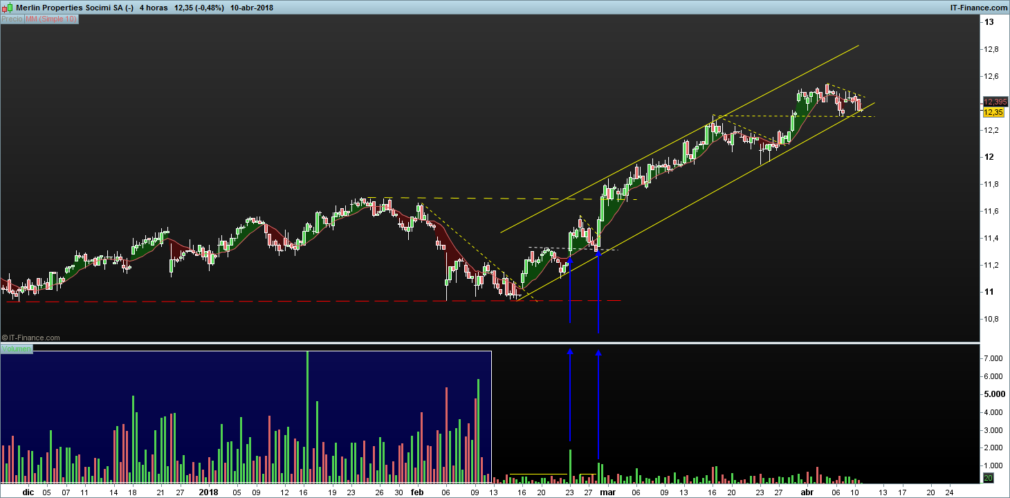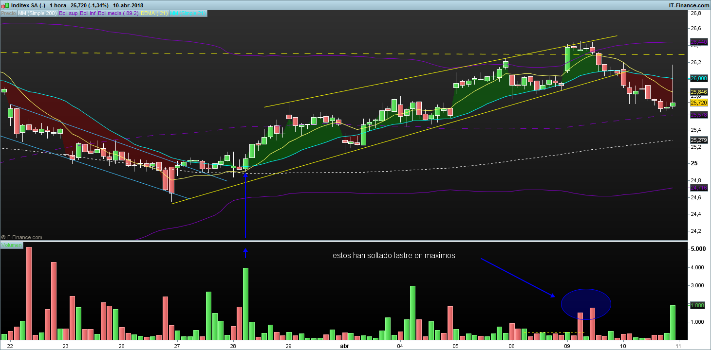 En el volumen no encontraras nada si no sabes que buscar, todo lleva un aprendizaje, de todas formas desde mediados de febrero el volumen en las acciones del ibex esta en mínimos, hay miedo y el dinero esta fuera, aun así te pongo un detalle para que veas como rompen niveles de resistencia con significativo aumento de volumen y con gap y como sueltan lastre en máximos en resistencias, con volumen en mínimos en todos porque hay miedo a que se den una buena piña