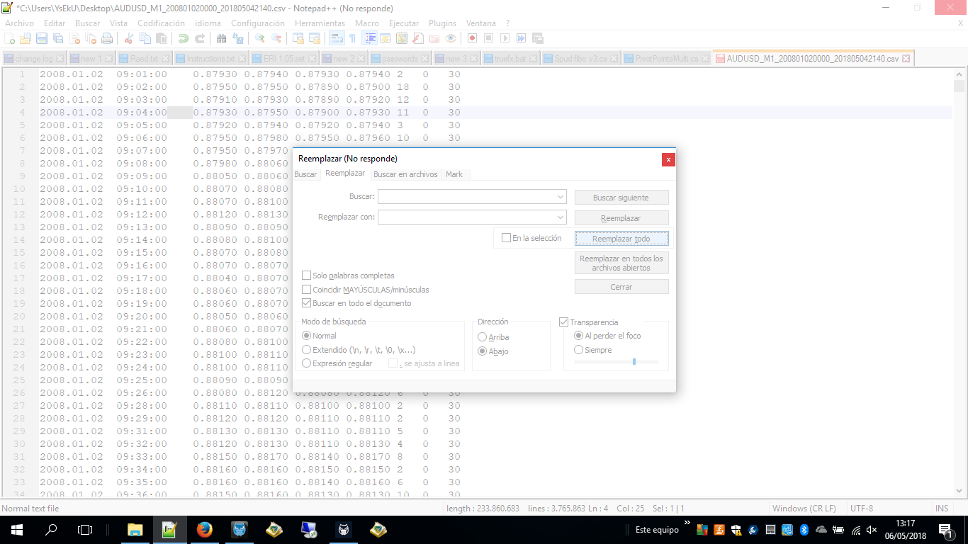 Una vez transformados los espacios en comas, guardamos los cambios y ya podemos importar los datos de MT5 en MT4.