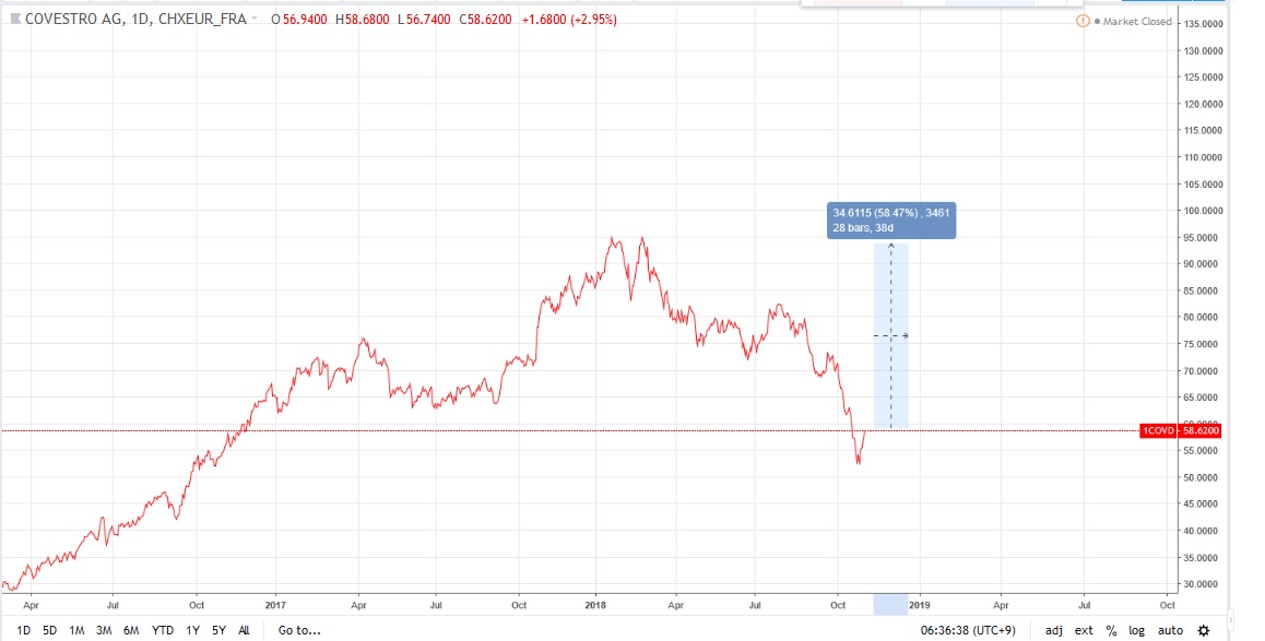 Pero quando miro de nuevo una acion la comparo con las restantes del mysma industria...y me pusse a mirar a covestro, una spinoff de bayer que ace polimeros de plastico